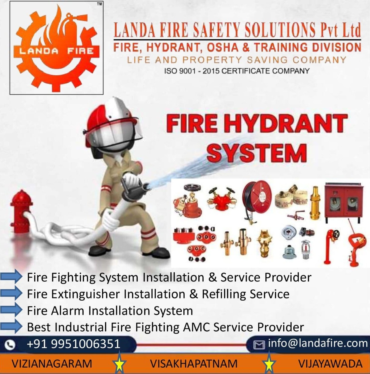 We LANDA FIRE SAFETY SOLUTIONS Pvt Ltd, situated at VIZIANAGARAM City, Visakhapatnam, Vijayawada, Andhra pradesh, Hyderabad , Telangana.we believe in providing dedicated services to all our valid customer, our first responsibility in LANDA FIRE is to the users, Workers,technicians safety officers engineers and all others companies, organizations or institutions, who use prouduts and Hydrant System Services to protect than the enivornment Our range of services includes tha following.