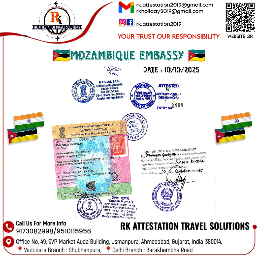 Get a Mozambique embassy attestation, you must first get your document authenticated by Indian authorities then MEA after that we can submit it to the respective embassy.