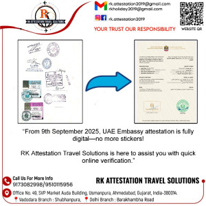 At RK Attestation Travel Solutions,The Best reliable Attestation Service in Ahmedabad,Vadodara and Delhi, Since 2019, we offer wide range of attestation service to our clients. The quality of service that we offer is unmatched and makes us the best in our field. Our vision is to deliver hassle-free visa,passport,translation attestation services to our esteemed clientele and make sure they have a wonderful experience with us. With years of hands on experience, our organization is just the perfect solution for all kinds of travel service in india. We take care of the entire process of travel, from the very beginning till the end to ensure that you can relax while we get your work done. Reliability, timely services and 100% guarantee of original documents are just some of our plus points. Thousands of satisfied customers recommend RK Attestation Travel Solutions for its travel services throughout the globe. To secure a visa for, it is essential that you get your educational or personal certificates along with professional or academic documents attested by your respective embassy/consulate in India and This procedure can be really baffling for people who don’t have adequate knowledge. This is why RK Attestation Travel Solutions offers end to end attestation services.
